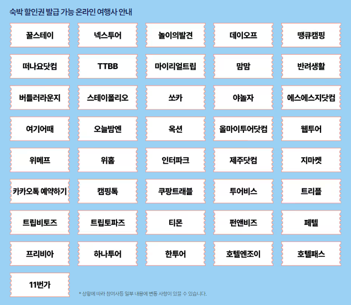 서울·경기·인천을 제외한 비수도권 지역의 숙박 시설 할인 쿠폰을 받을 수 있으며 2만원 이상 7만원 미만 예약할 시 2만원 할인권을, 7만원 이상 숙박상품을 예약할 시 3만원 할인권을 지급합니다. 할인 쿠폰은 야놀자, 여기어때, 호텔엔조이 등 참여 온라인 여행사를 통한 발급 및 사용이 가능하며 각 여행사 플랫폼마다 혜택이 다르오니 잘 살펴보신 후 사용하는 게 좋을 것 같습니다.
