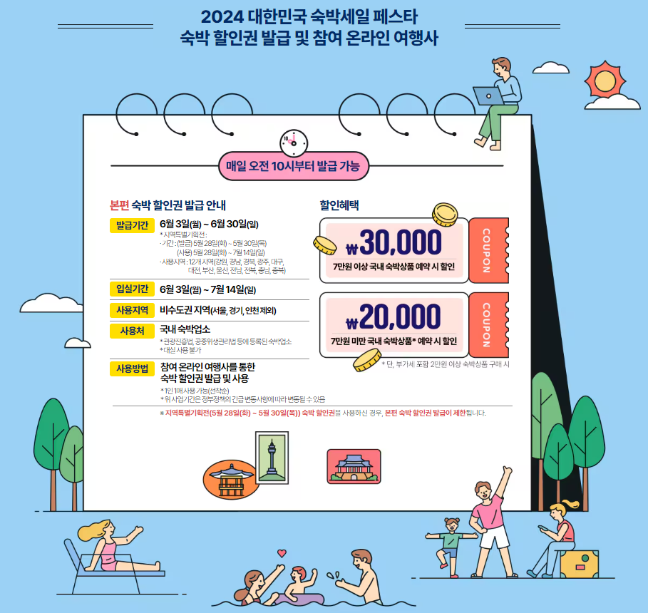 안녕하세요. 오늘은 2024년 대한민국 숙박세일 페스타에 대하여 말씀드리고자 합니다. 2024년 대한민국 숙박세일 페스타는 문화체육관광부와 한국관광공사에서 지역 관광 활성화와 경기 활성화를 위해 6월 3일부터 30일까지 매일 오전 10시부터 선착순 발급으로 국내 숙박업소를 2만원 ~ 5만원 할인하여 주는 쿠폰을 지급하는 형식의 캠페인입니다. 정부와 지방자치단체, 민간 등 240여 개 기관이 참여한 가운데 숙박업소 및 열차 요금 할인 등 여행상품 관련하여 다양한 할인 혜택이 주어질 예정이라고 합니다.