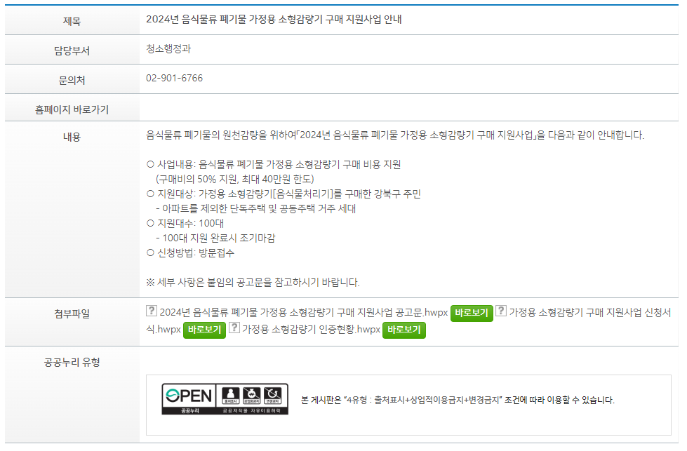 이상으로 음식물 처리기 지원금을 받기 위한 내용을 알아보았습니다. 하지만 지원금은 예산 소진 시까지로 이미 마감된 지역들도 많다고 하니 서둘러 확인하시고 음식물 처리기 구매 계획이 있으시다면 지원금 신청을 하시어 지원받으시길 바랍니다.