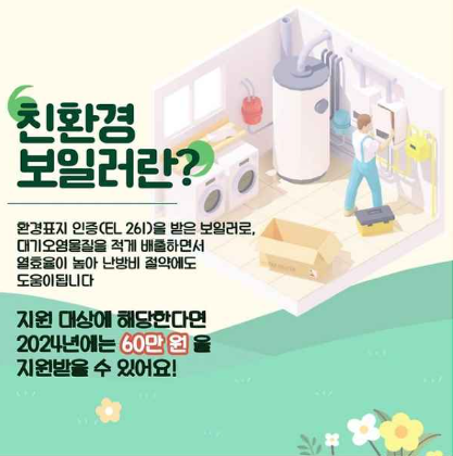 친환경 보일러는 환경표지 인증을 받은 보일러로 노후 보일러를 친환경 보일러로 교체 시 질소산화물 배출을 약 87% 줄여주며 이산화탄소 배출 또한 약 19%저감, 난방비가 최대 44만원이 절약된다고 합니다.